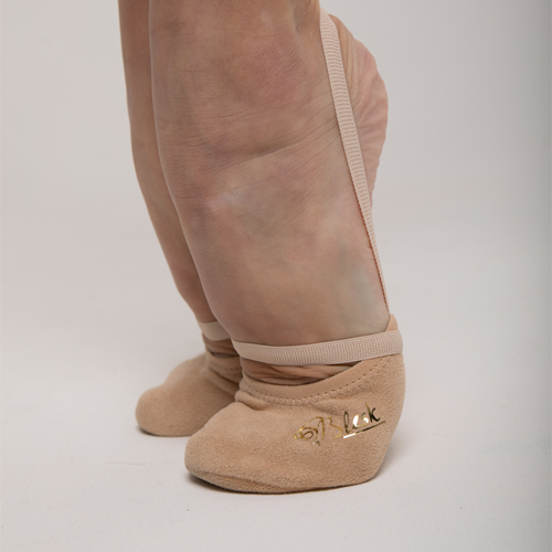 Blesk half-fingers Stretch Comfort Gold model for rhythmic gymnastics and dancing classes from ArtBlesk atelier. The half-boots are made of thin microfiber, sit comfortably on the gymnast's leg and perfectly fit the foot. They do not form folds or "bubbles". Soft, comfortable rubber bands with silicone inserts do not press, do not fall off and do not cause discomfort during training and performances. They are ideal for competitions where you need to show a beautiful lift and foot! Nude color suits any skin color and looks great. The Blesk lettering is golden in color.