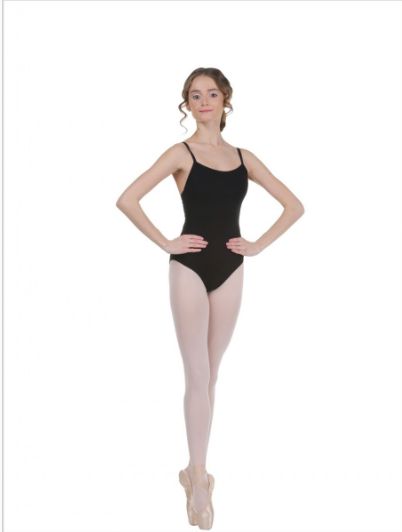A classic black model with a straight backline just below the shoulder blades and an average legline. Moderately deep neckline.