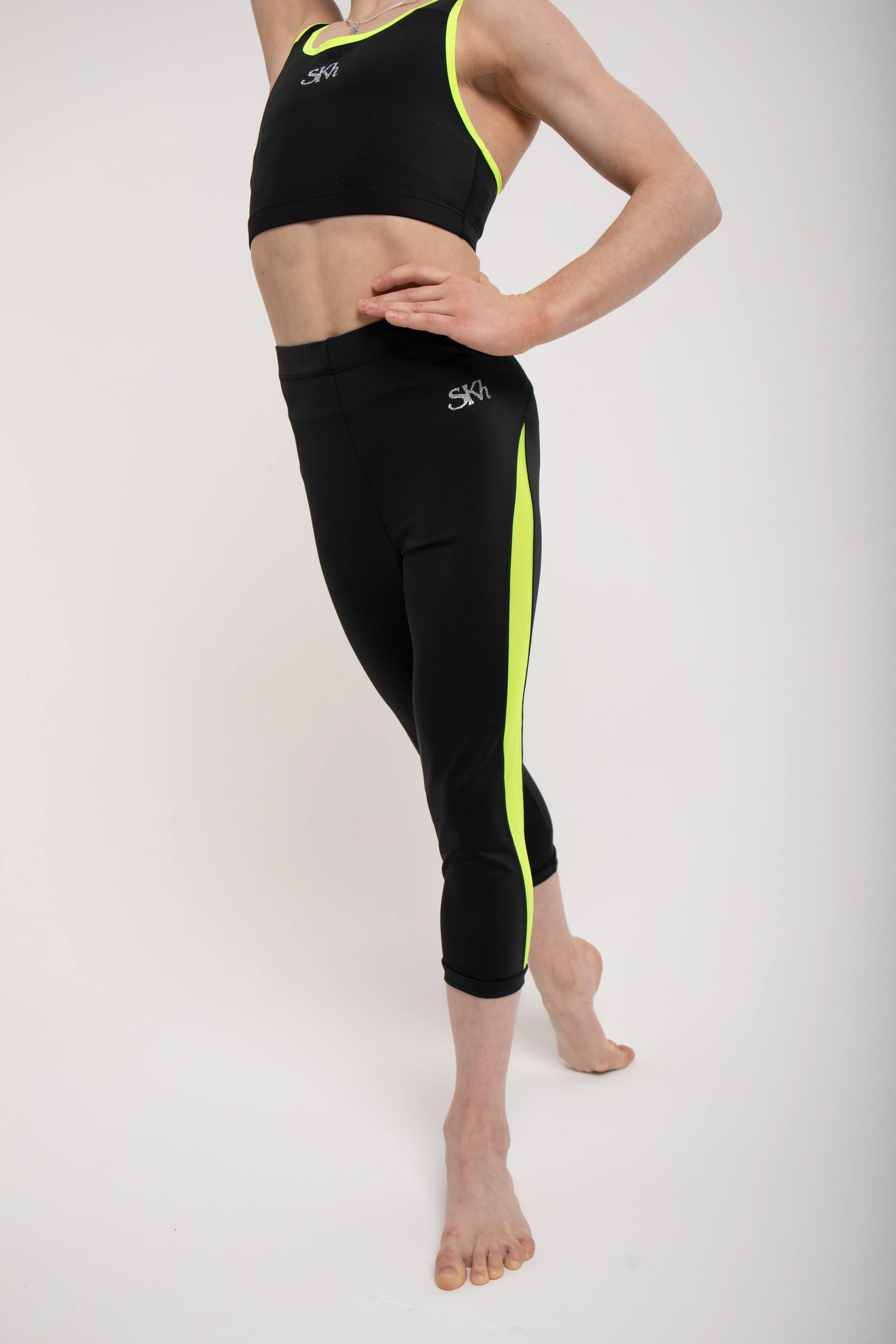 The leggings are made of high-quality black biflex. They have a classic form-fitting silhouette and a colored mesh insert.The fabric is pleasant to the body and to the touch. Perfectly combined with a top from the collection of Svetlana Khorkina.