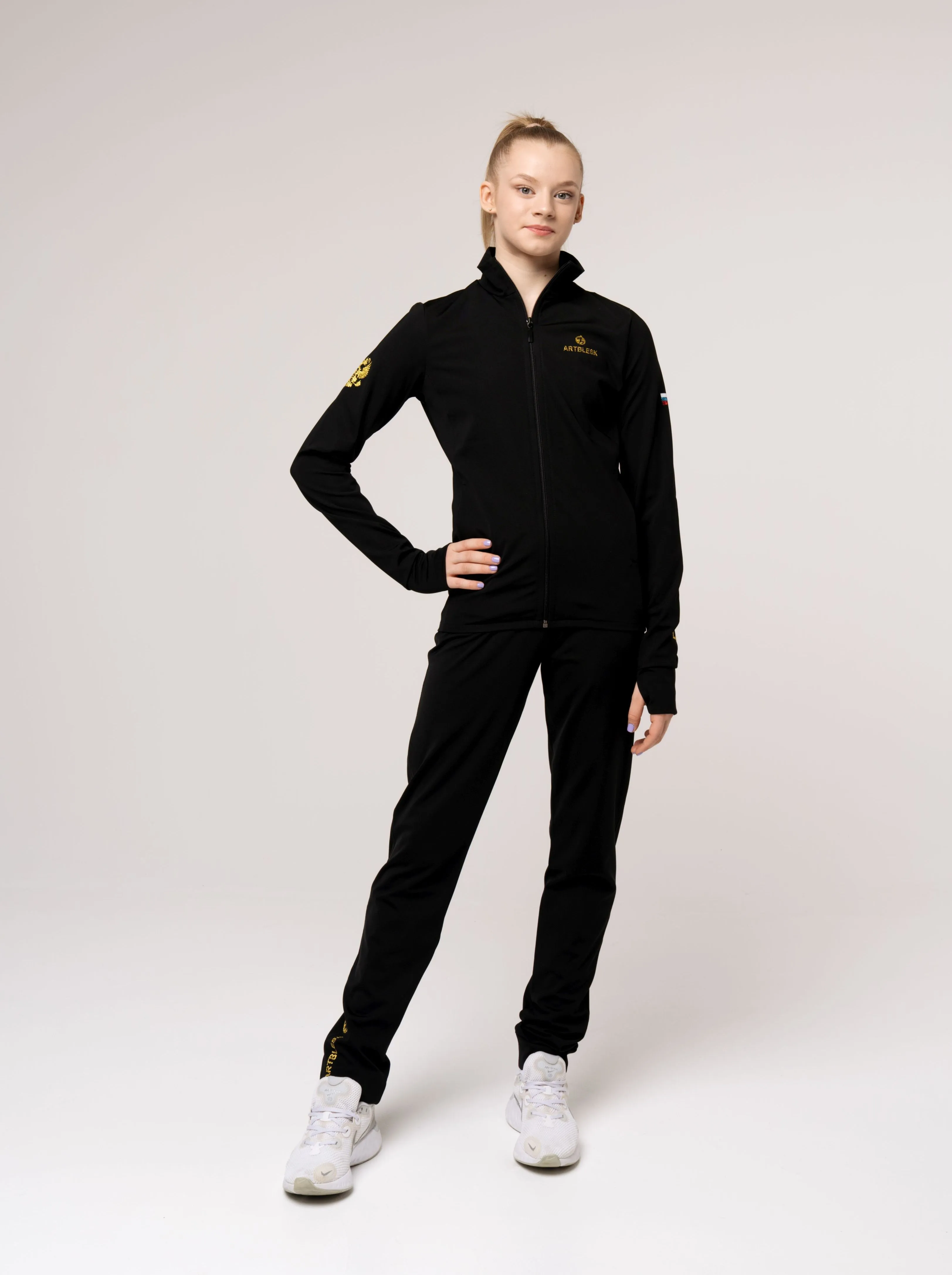 The GOLD tracksuit is made of high-quality black knitted fabric. Lotto is a double knit, with a smooth front and a delicate micro-fleece from the inside. The fabric is elastic, resistant to the appearance of puffs, perfectly retains its shape, does not restrict movement. If the care recommendations are followed, the fabric retains its properties for a long time. The seal on the suit is made of gold-colored thermo-film. The suit is suitable for outdoor training in cool weather. It goes well with a T-shirt or a top from the GOLD collection.