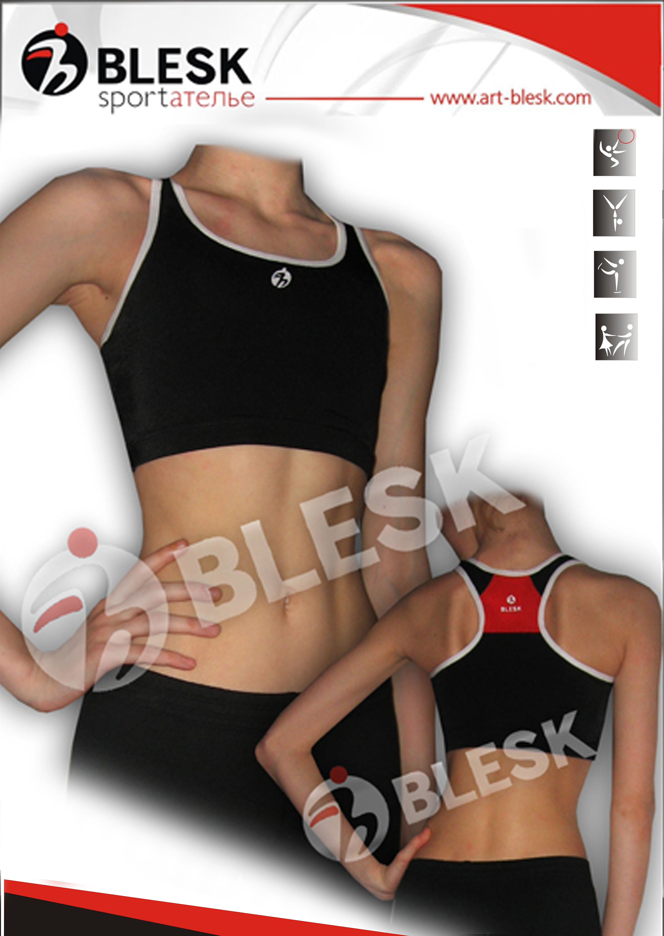 A black viscose sports top with a red insert. Round neck, wide shoulder straps, wrestling back, supportive elastic band under the chest. Thanks to the elastic fabric and the tight fit, it is almost not felt on the body.