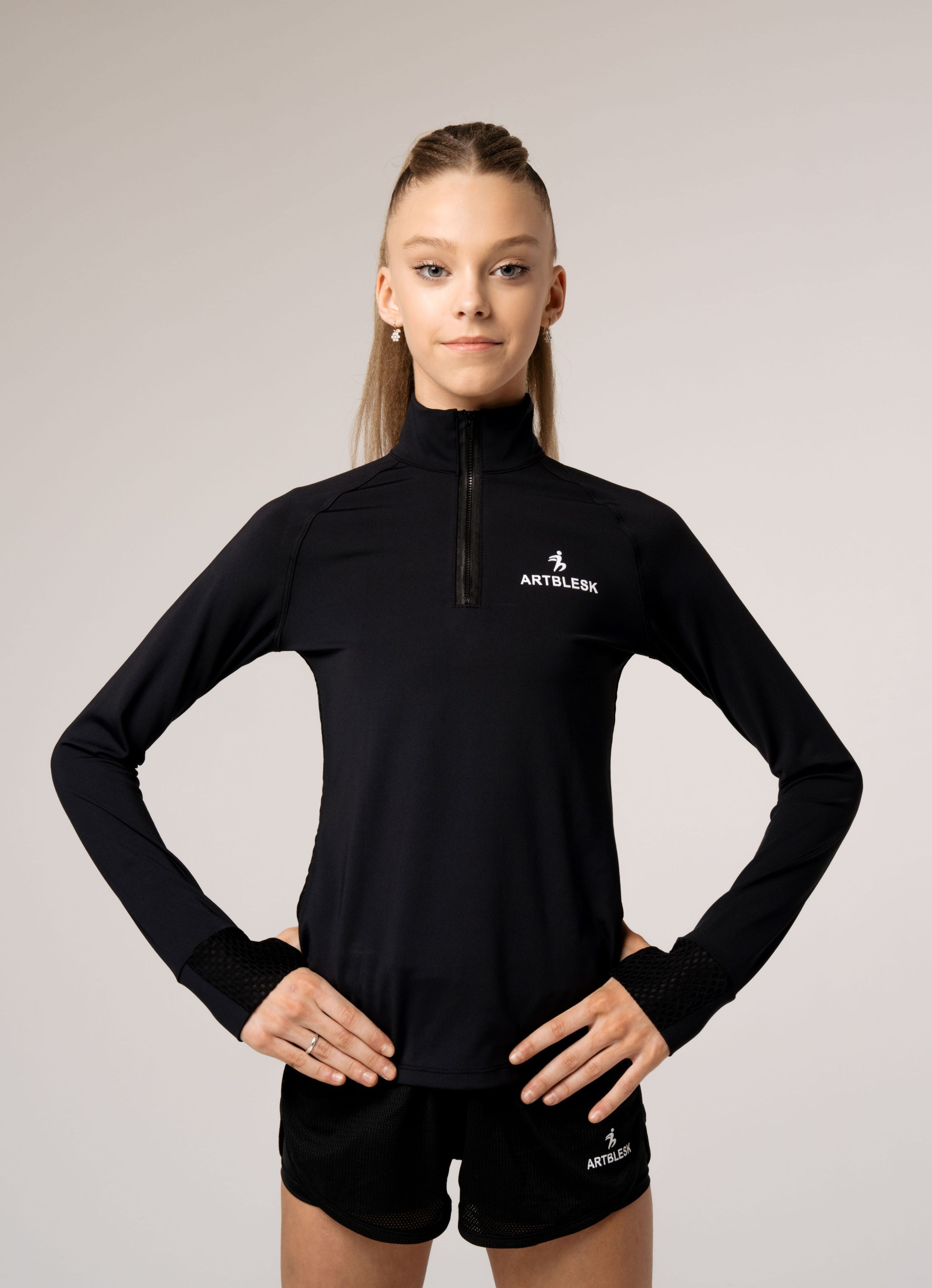 ARTBLESK longsleeve is made of high-quality black knitted fabric. The fabric is elastic, breathable, does not restrict movement, holds its shape perfectly, without losing its qualities even after repeated washes. The zipper stand-up collar gives the longsleeve a stylish look, and also allows you to adjust the level of thermal insulation, which is especially important during outdoor workouts. The fitted silhouette of the longsleeve provides an excellent fit. The product is printed with a white thermal film. It fits perfectly with the leggings from the ARTBLESK collection.
