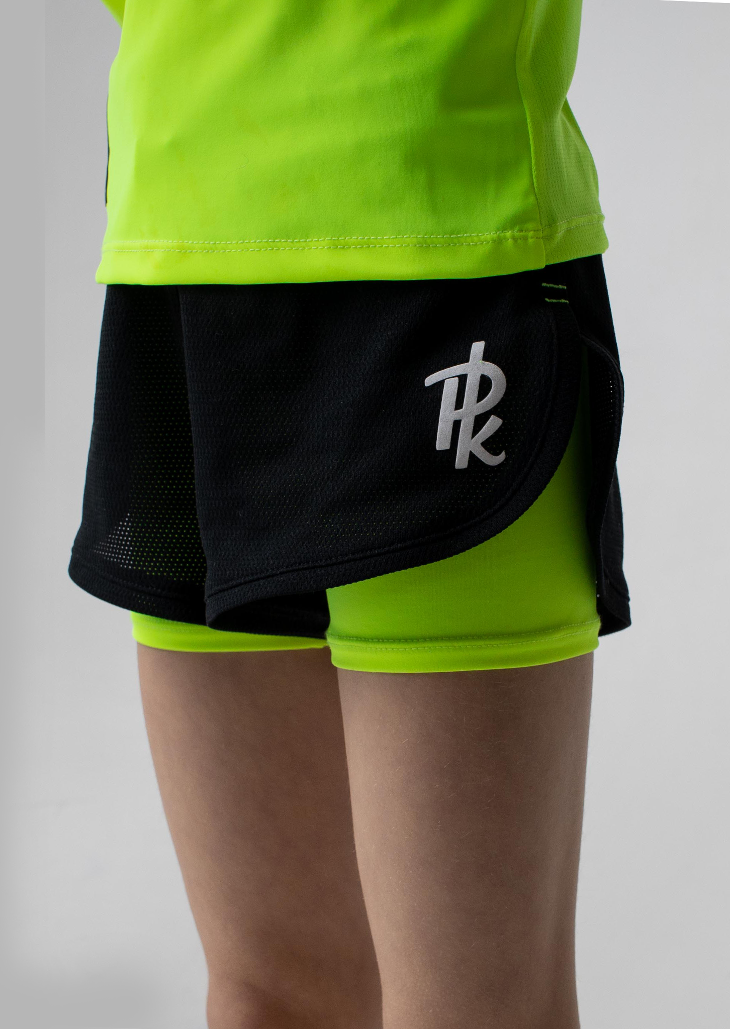 Double shorts made of sports knitwear: the upper layer is loose-cut shorts, the lower ones are bright, more form-fitting. Perfectly combined with a bright top.