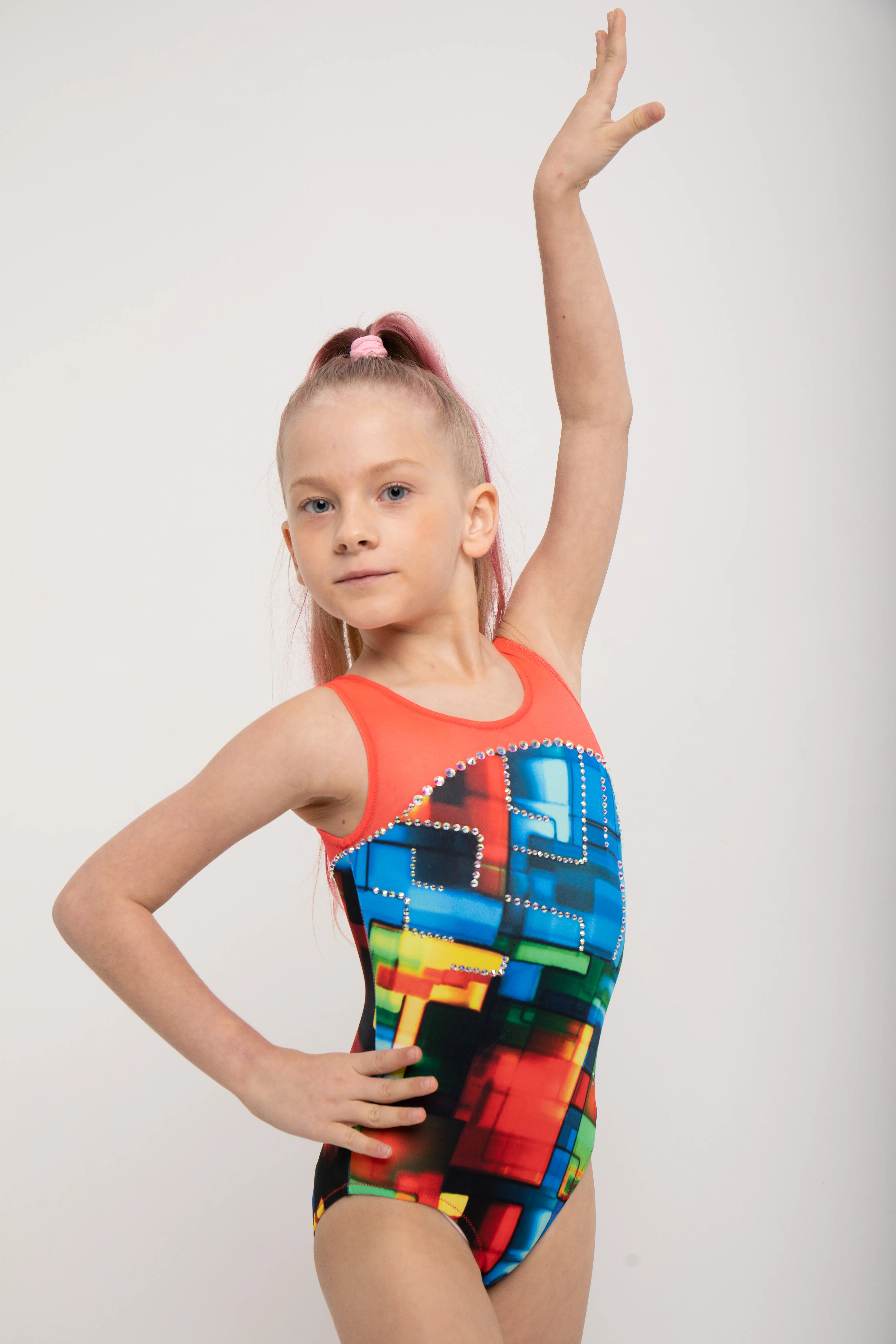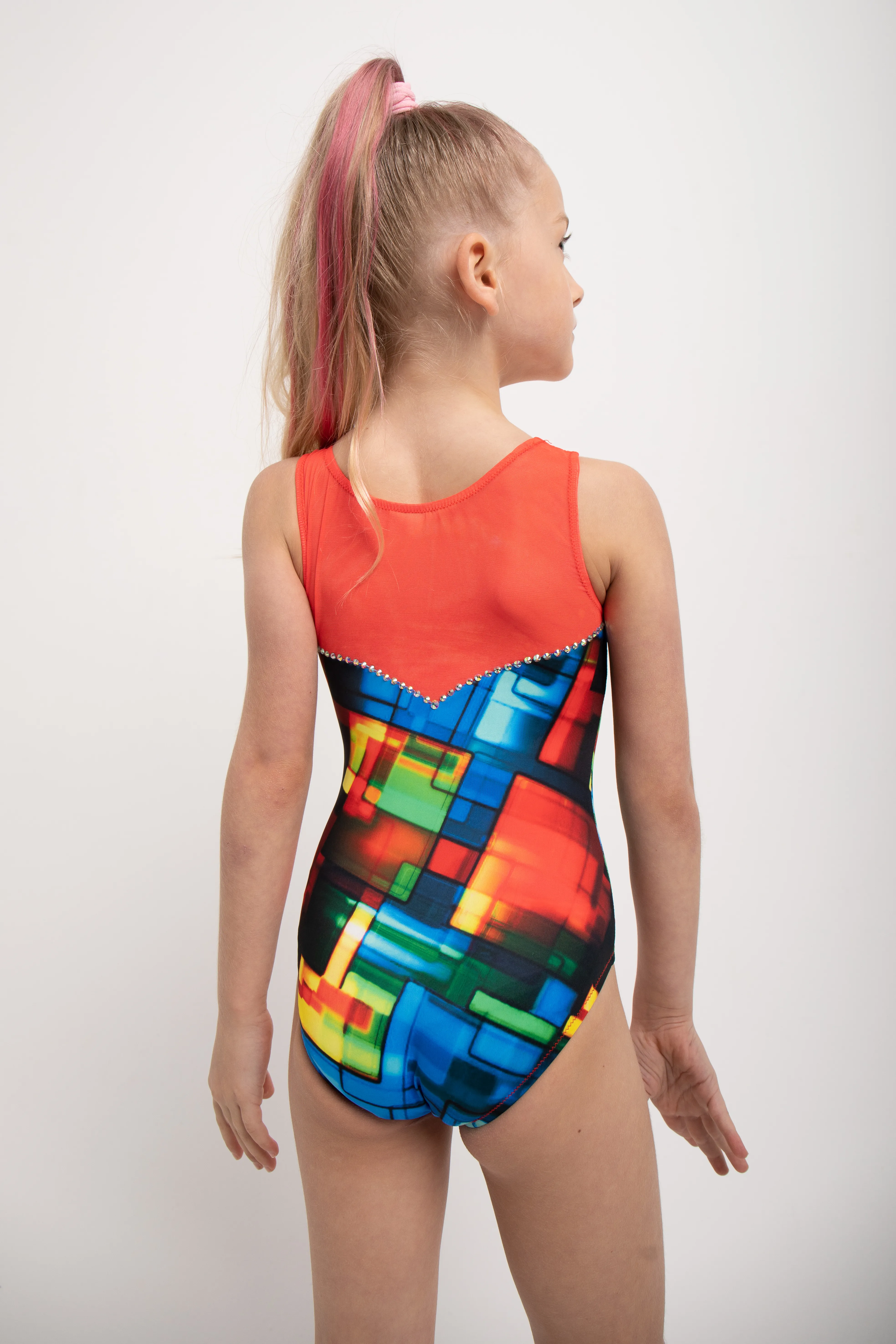 215 adhesive rhinestones are Pre-owned on the leotard.