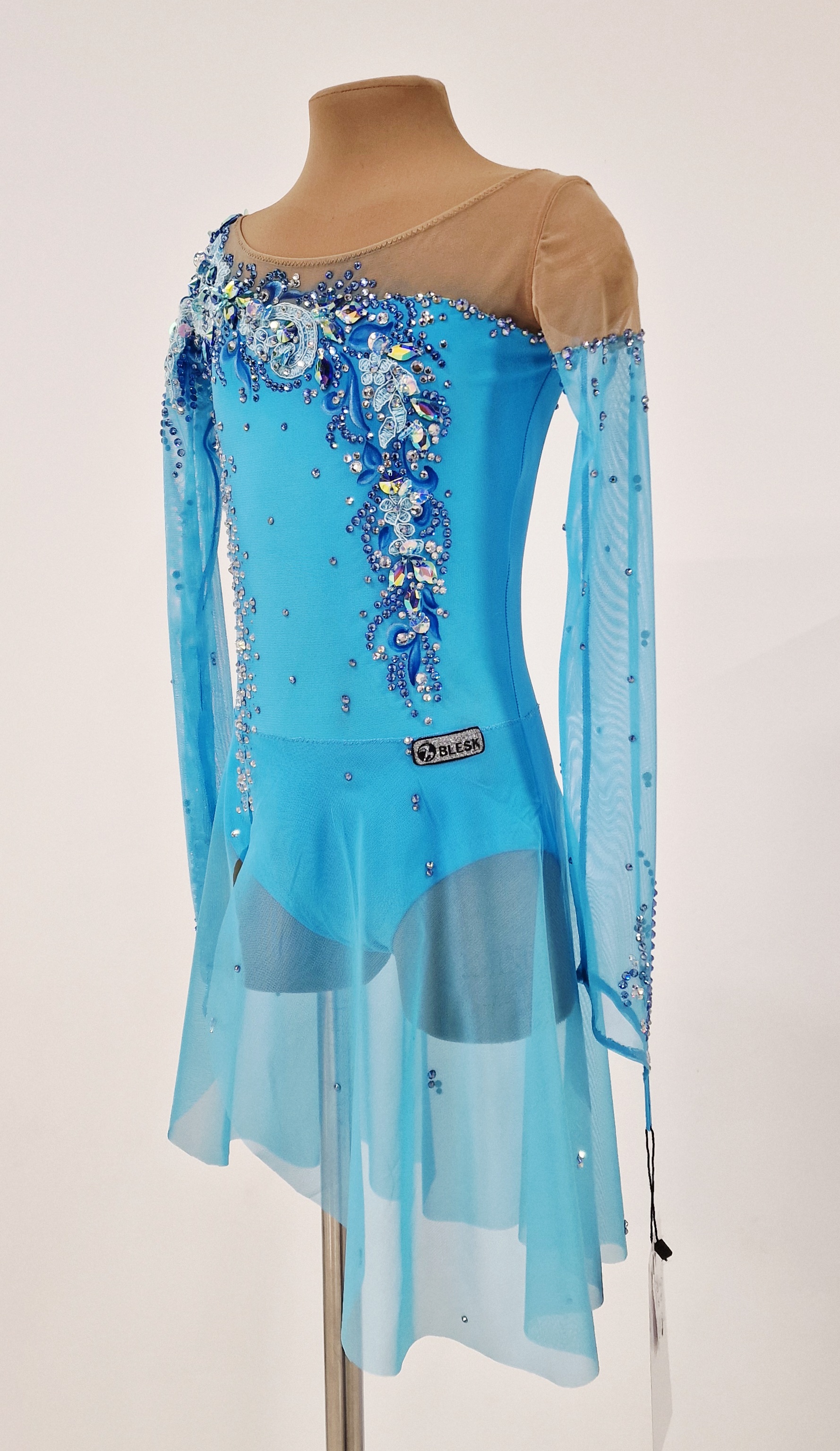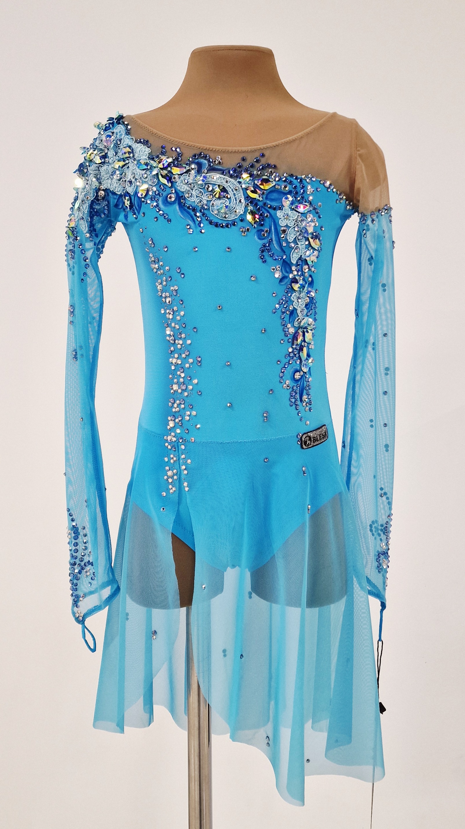The leotard uses 1,800 glue rhinestones and 40 large sewn rhinestones.