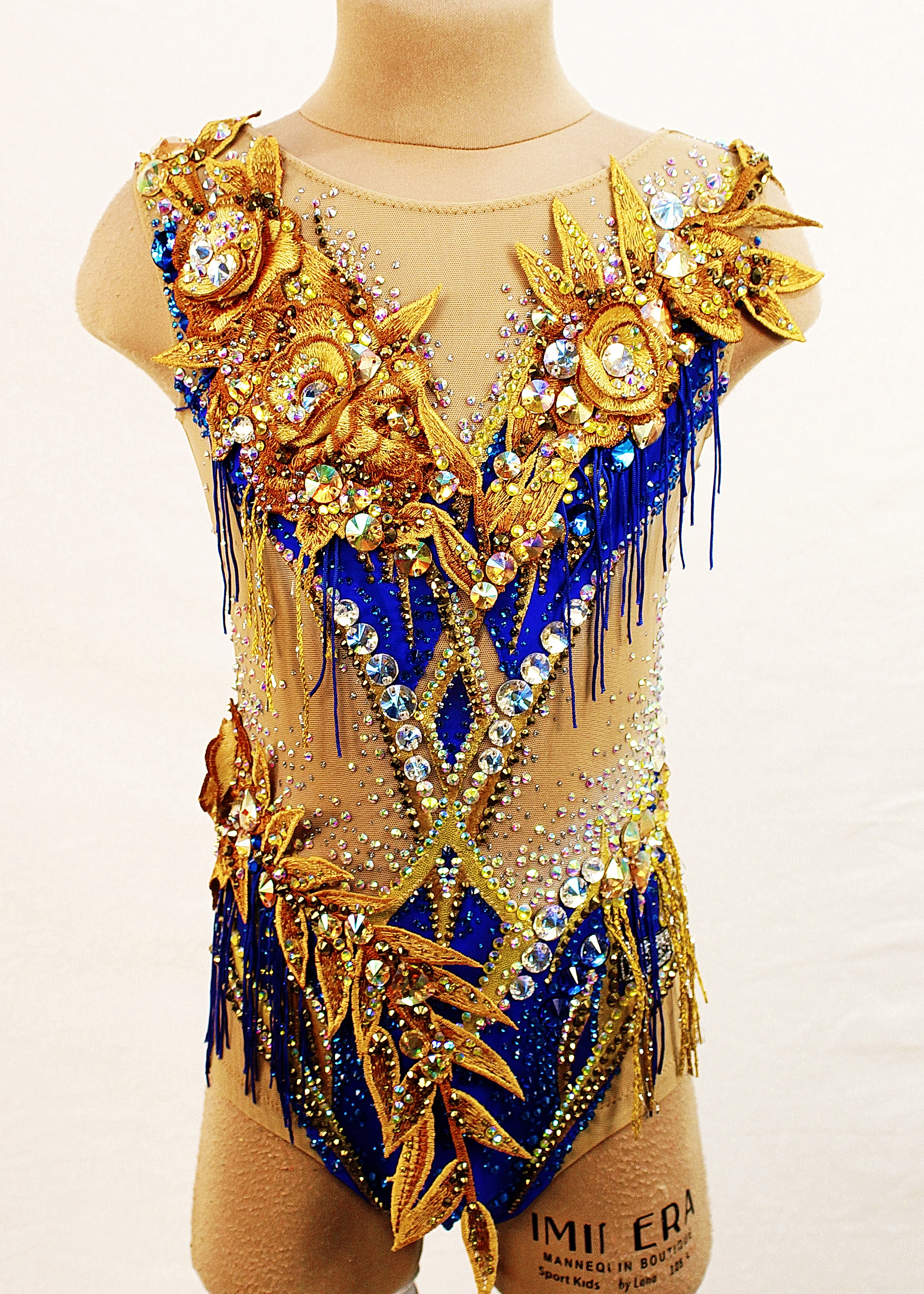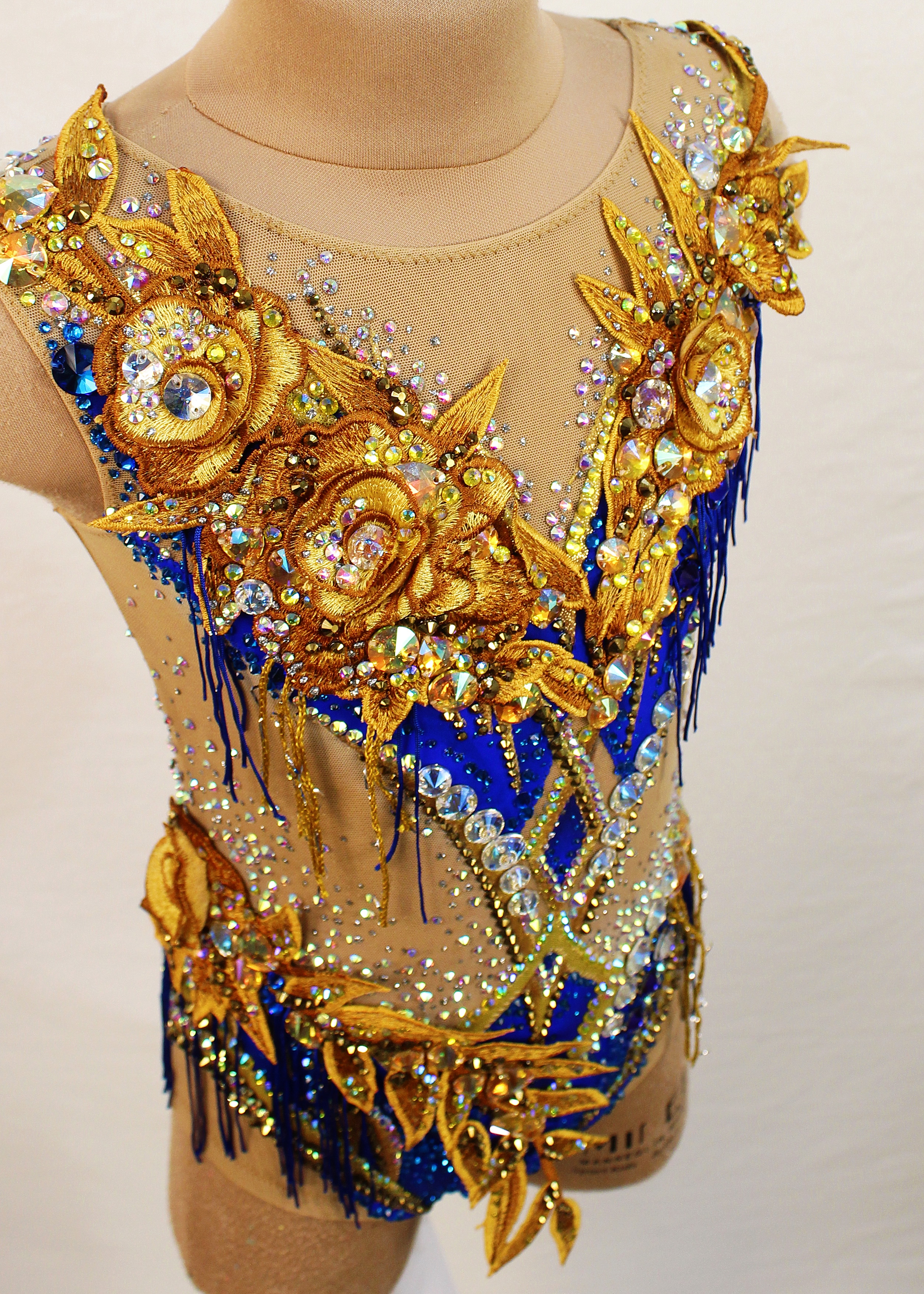 The leotard uses 3,400 adhesive and 116 large sewn rhinestones.