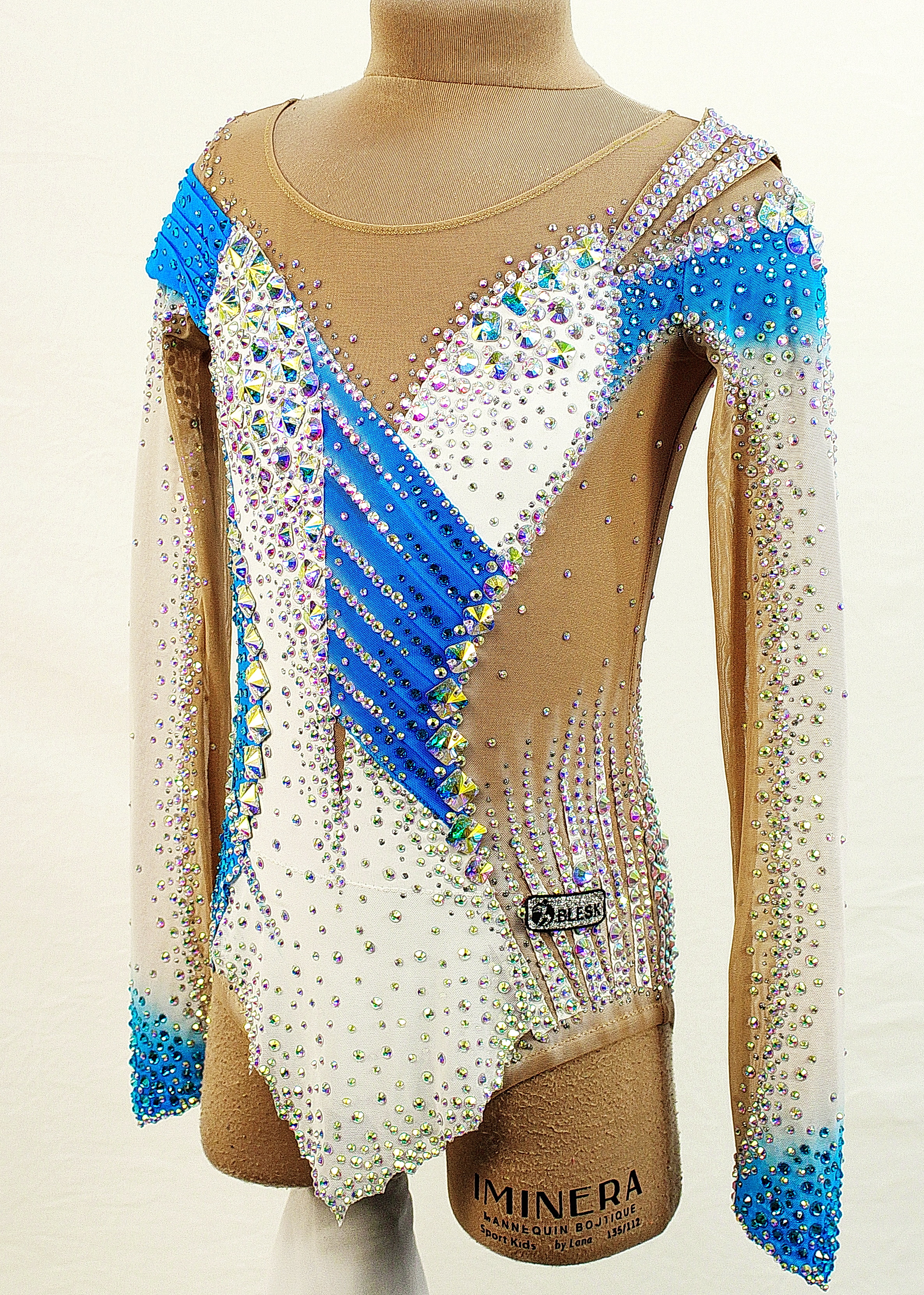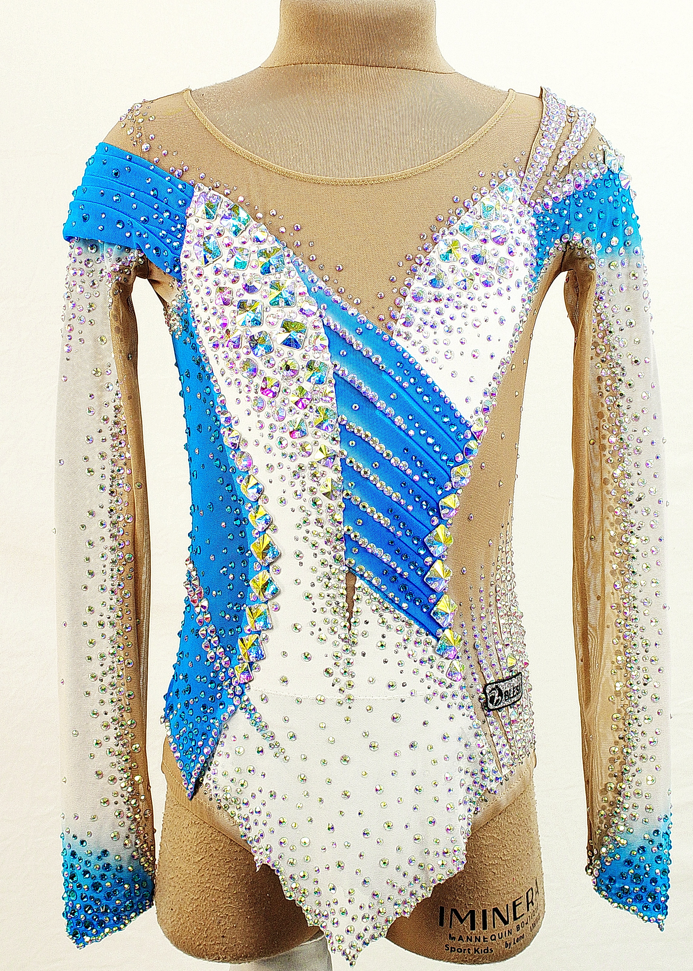 The leotard uses 4,885 adhesive and 60 large sewn rhinestones.