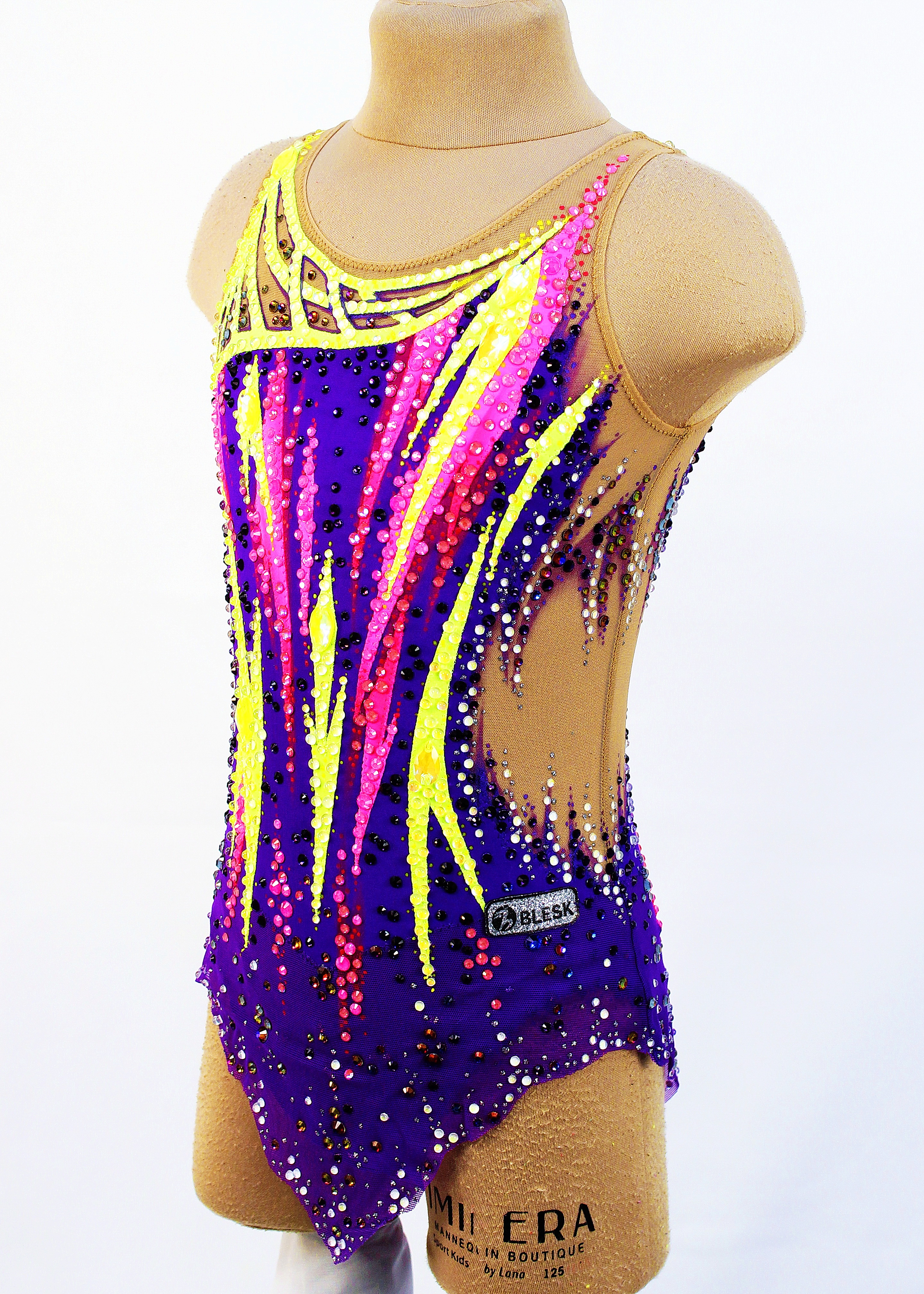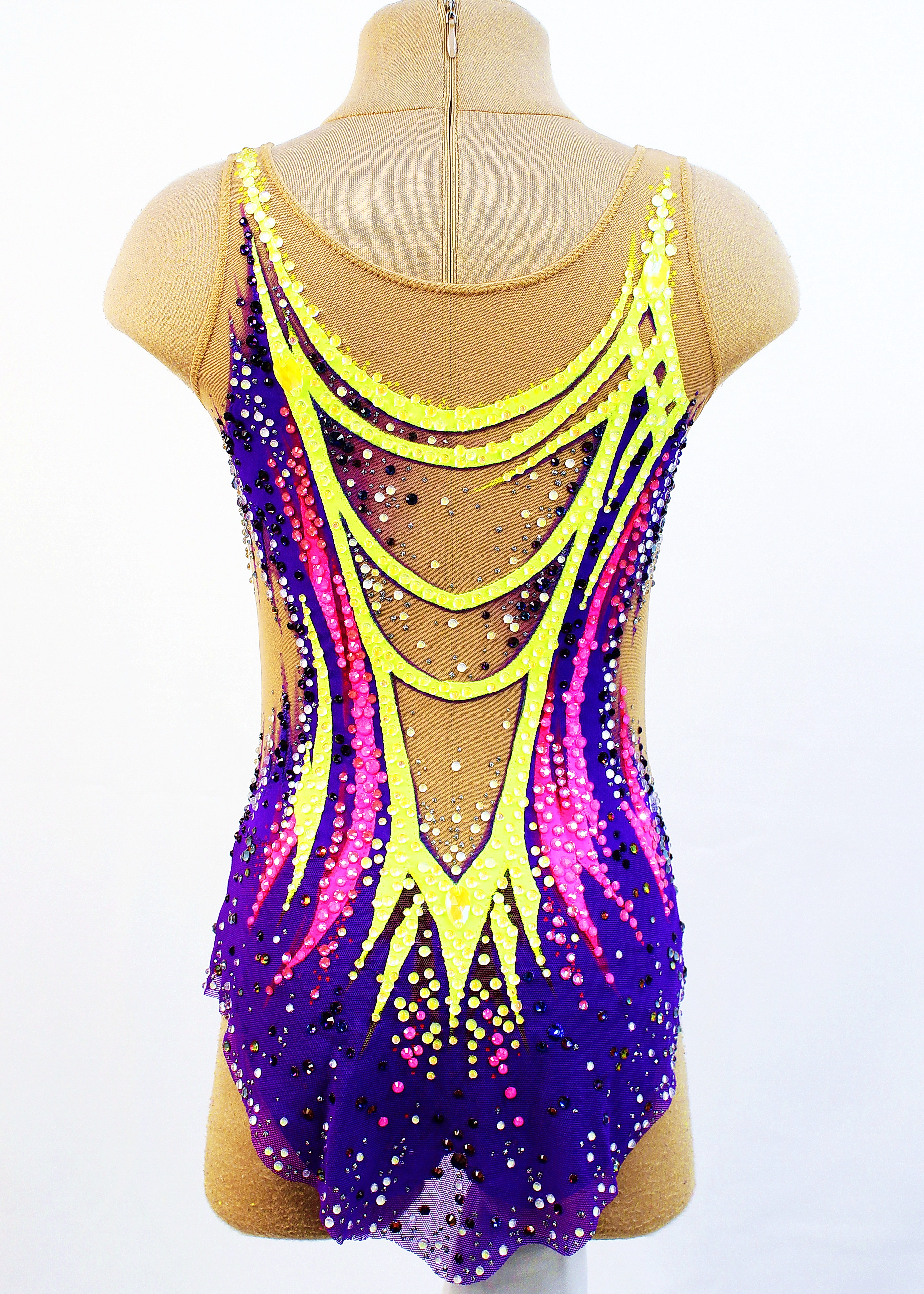 The leotard uses 2,648 glue and 10 large sewn rhinestones.