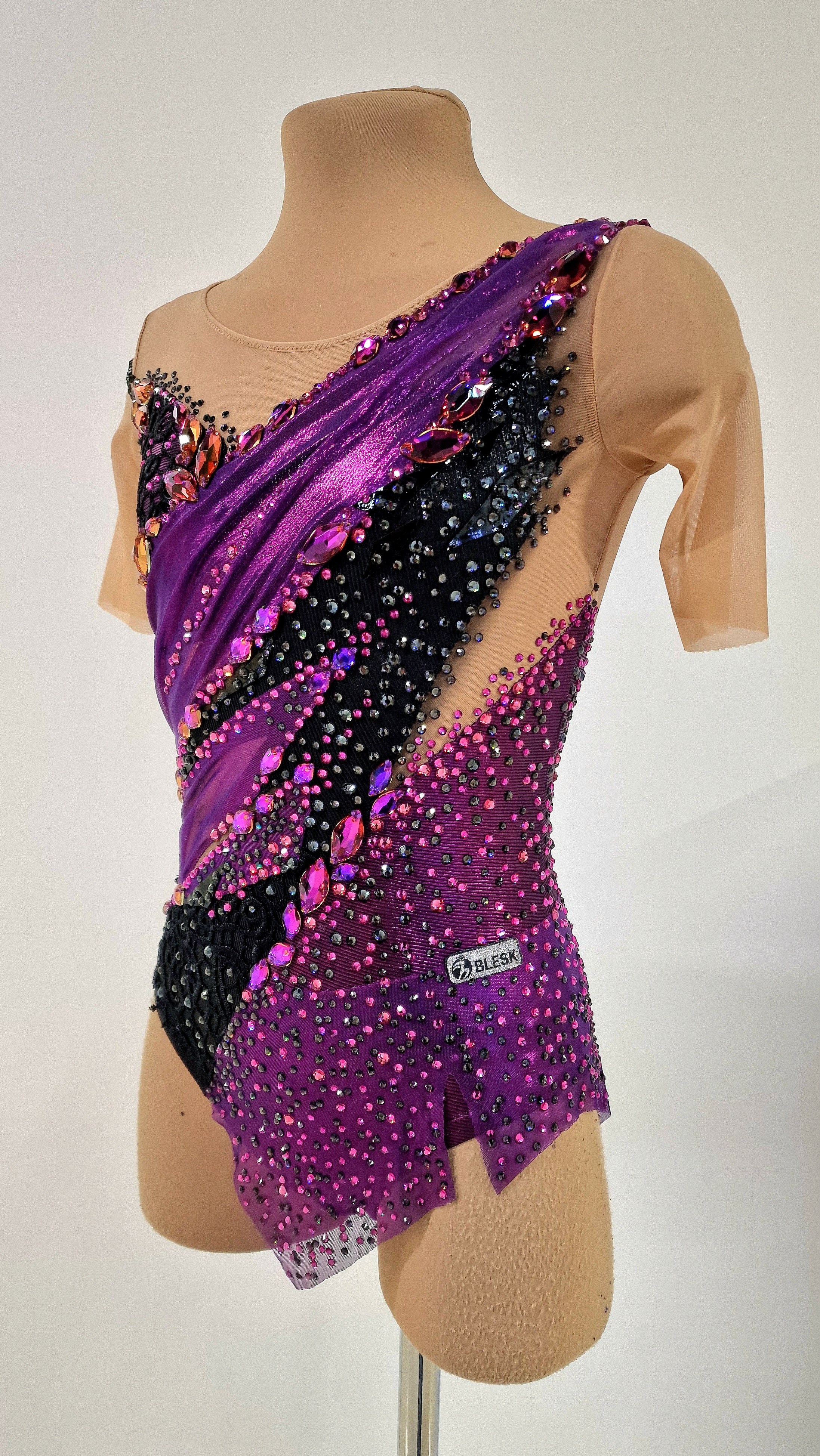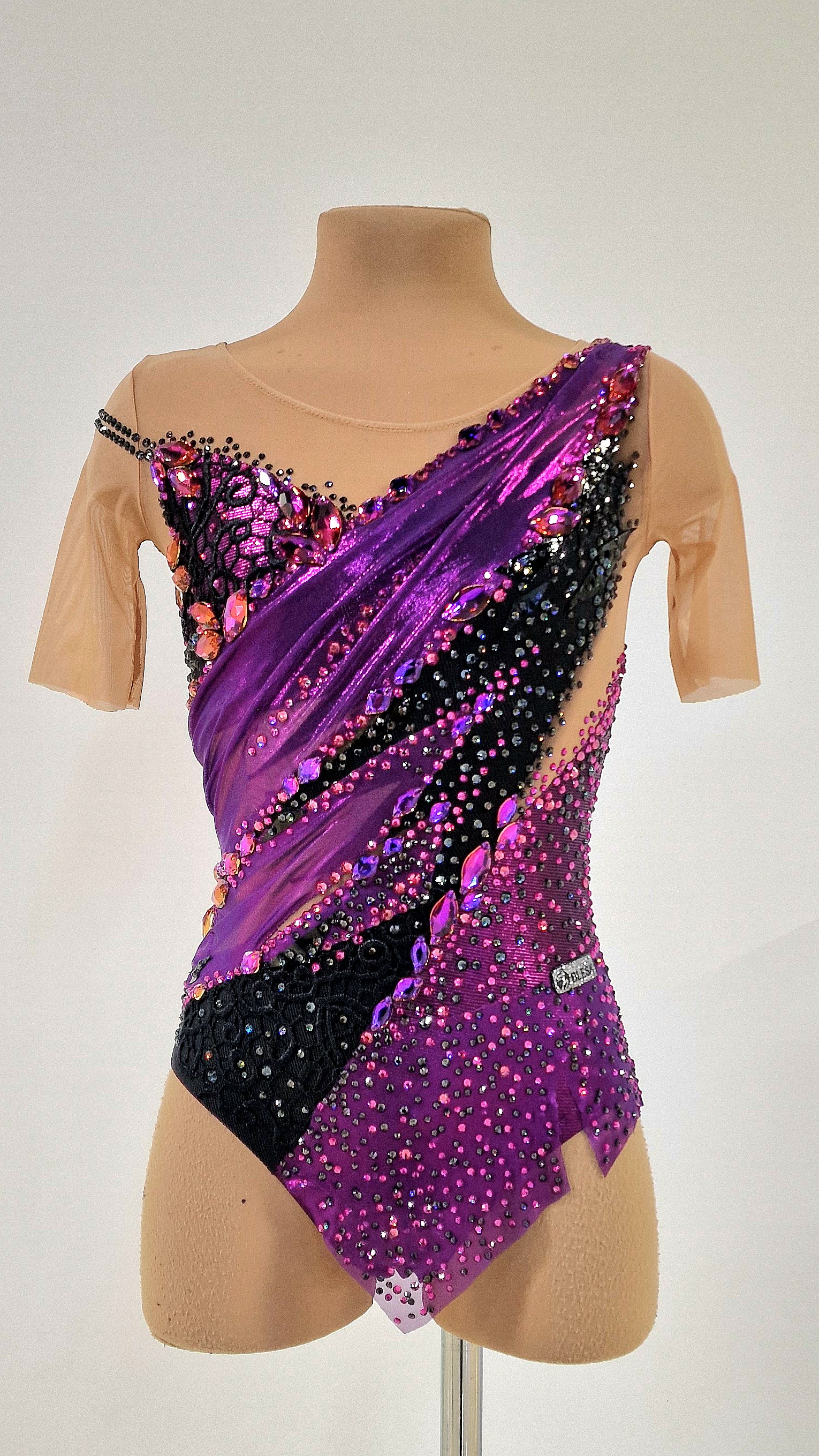 The leotard uses 3,400 adhesive and 84 large sewn rhinestones.