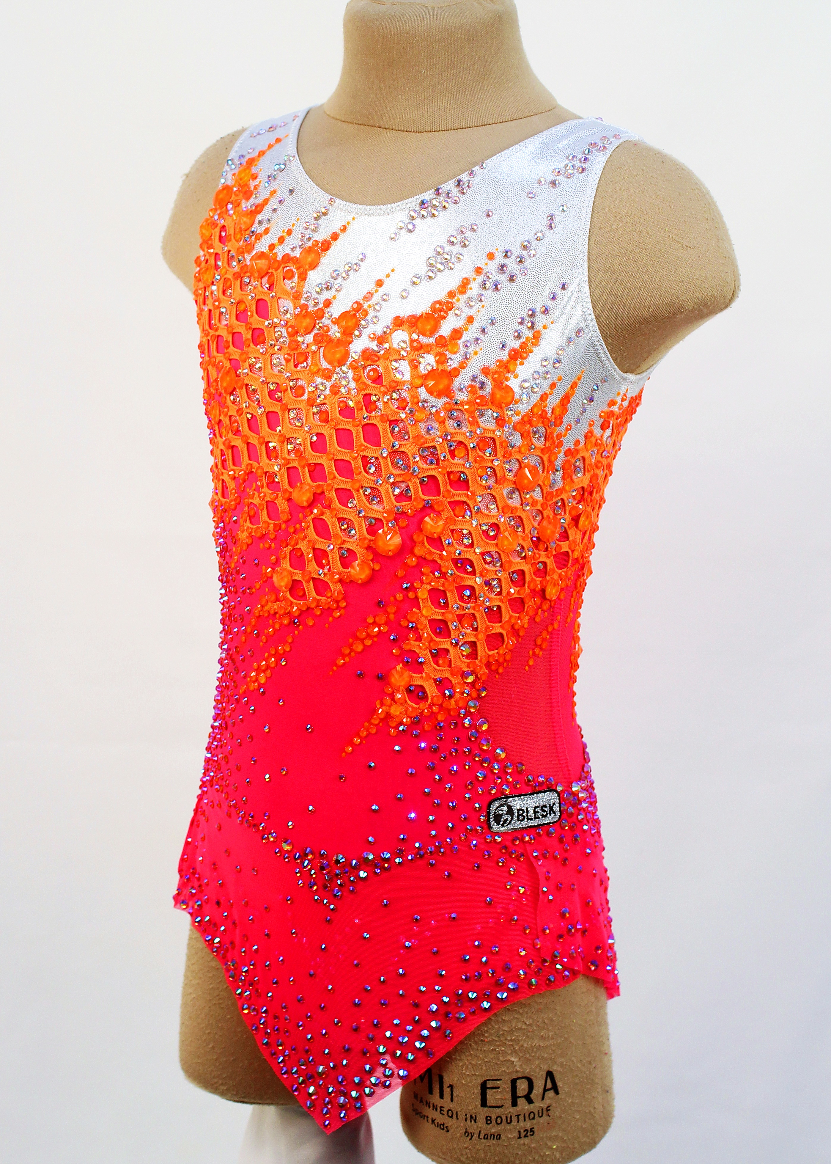 The leotard uses 3300 adhesive and 50 large sewn rhinestones.