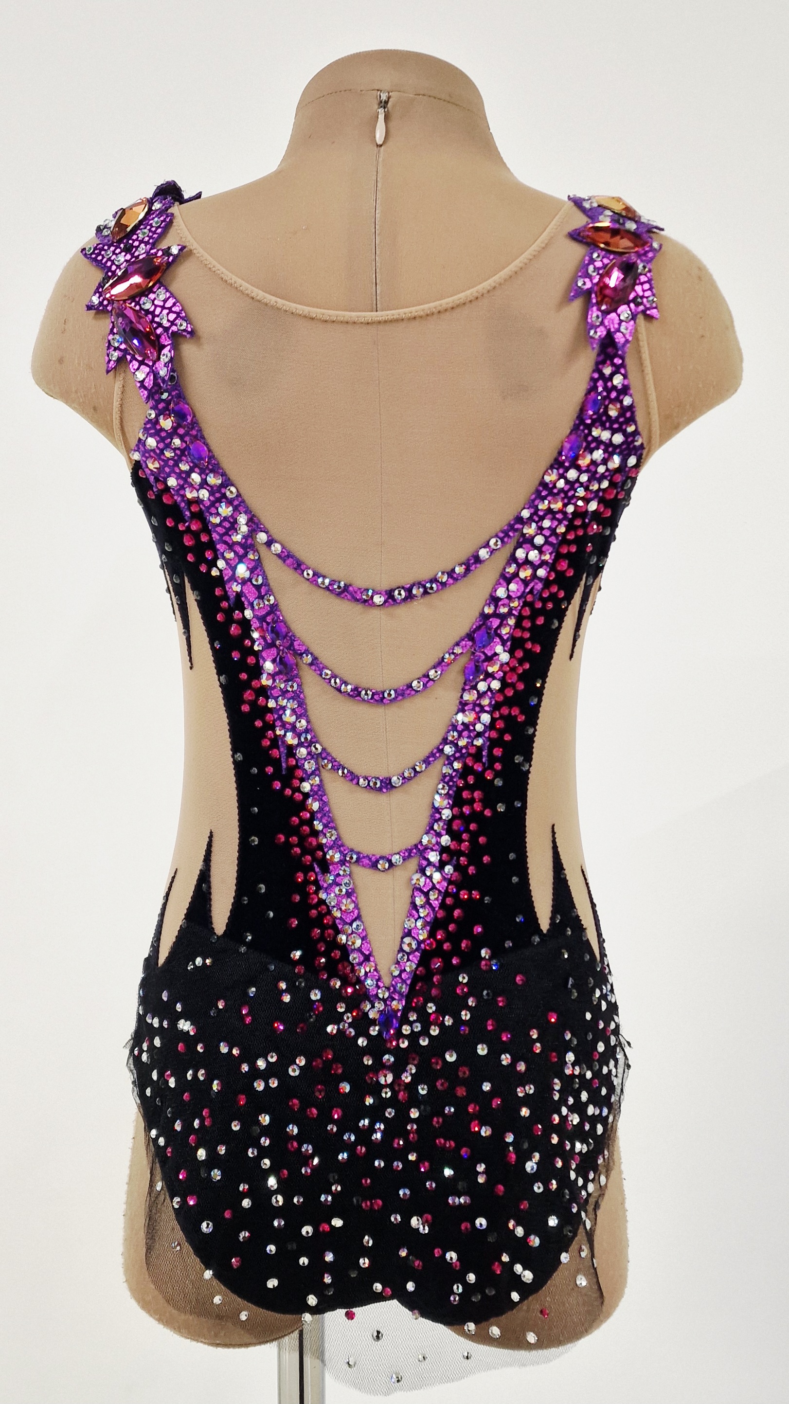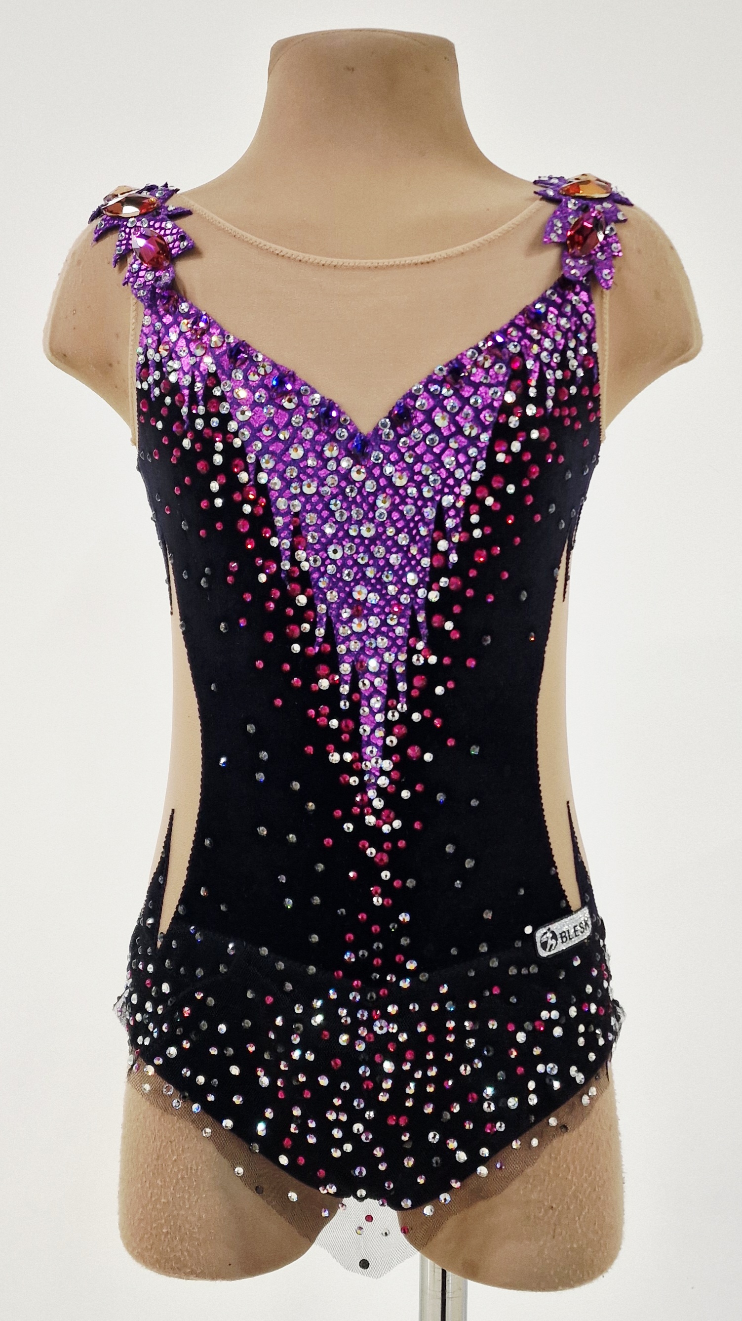 Height 140-150 cm, size 34, bust 66-70 cm, arch 122-126 cm.The leotard uses 1,900 adhesive and 32 large sewn rhinestones.
