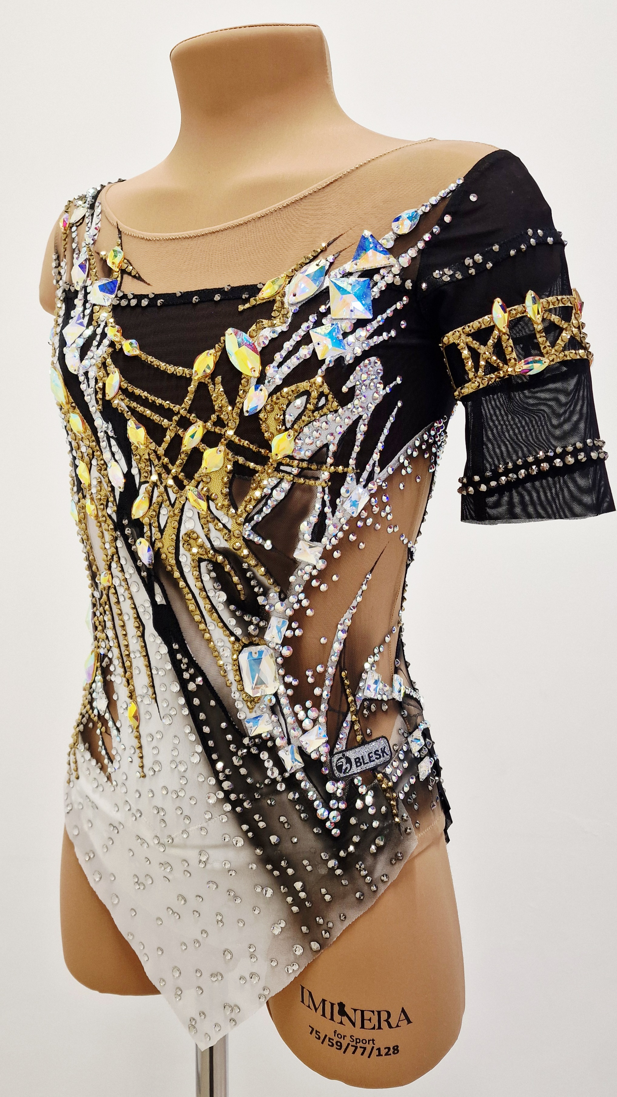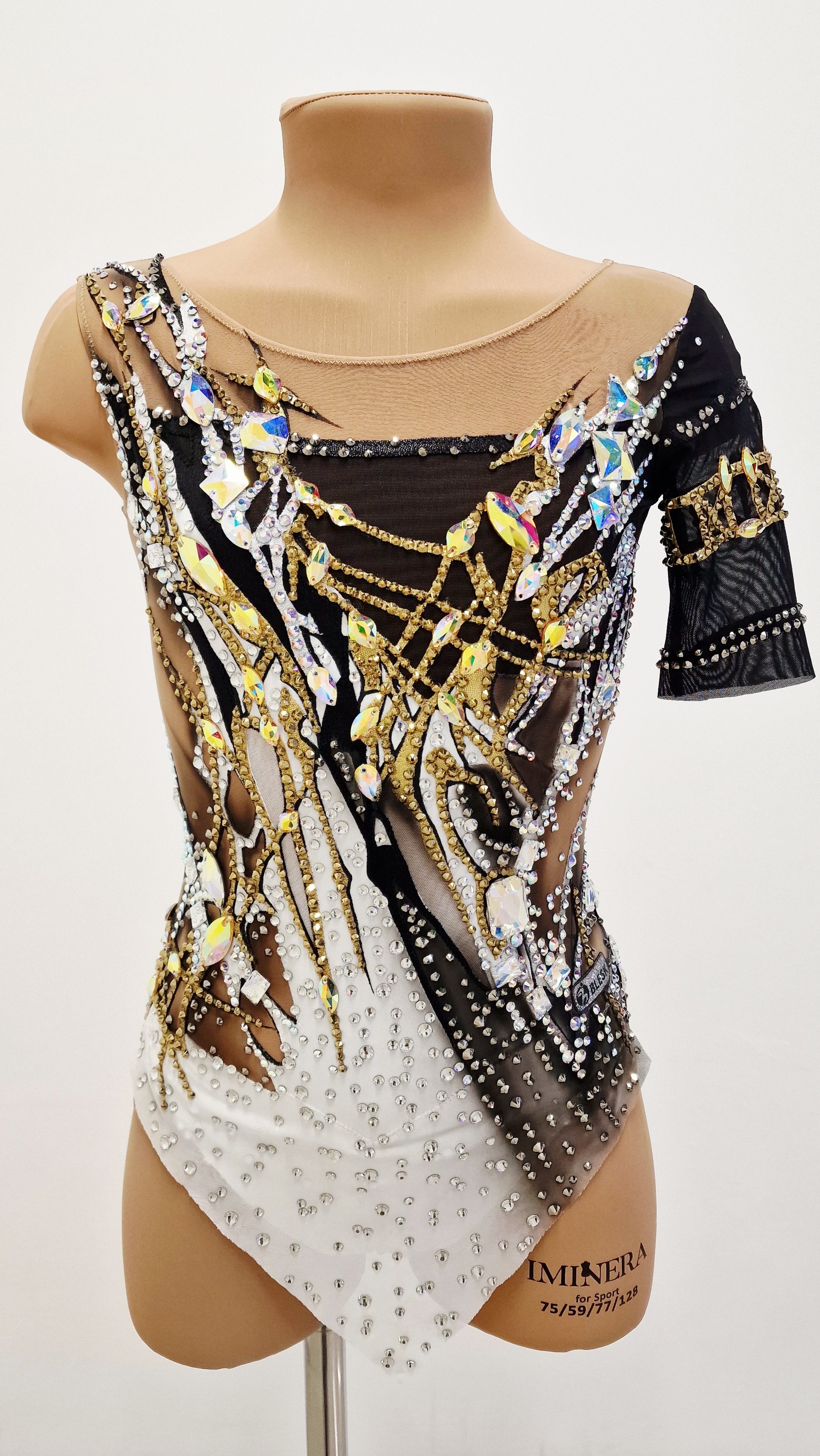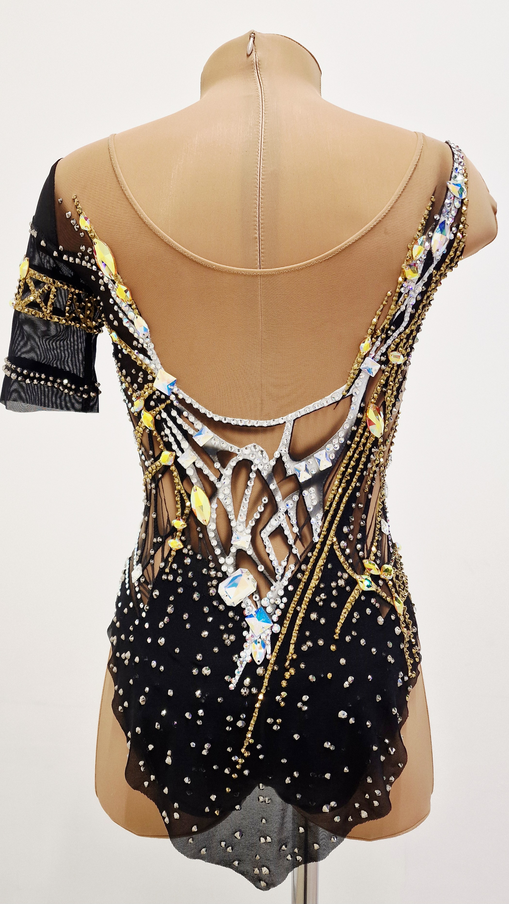 The leotard uses 3212 adhesive and 99 large sewn rhinestones.