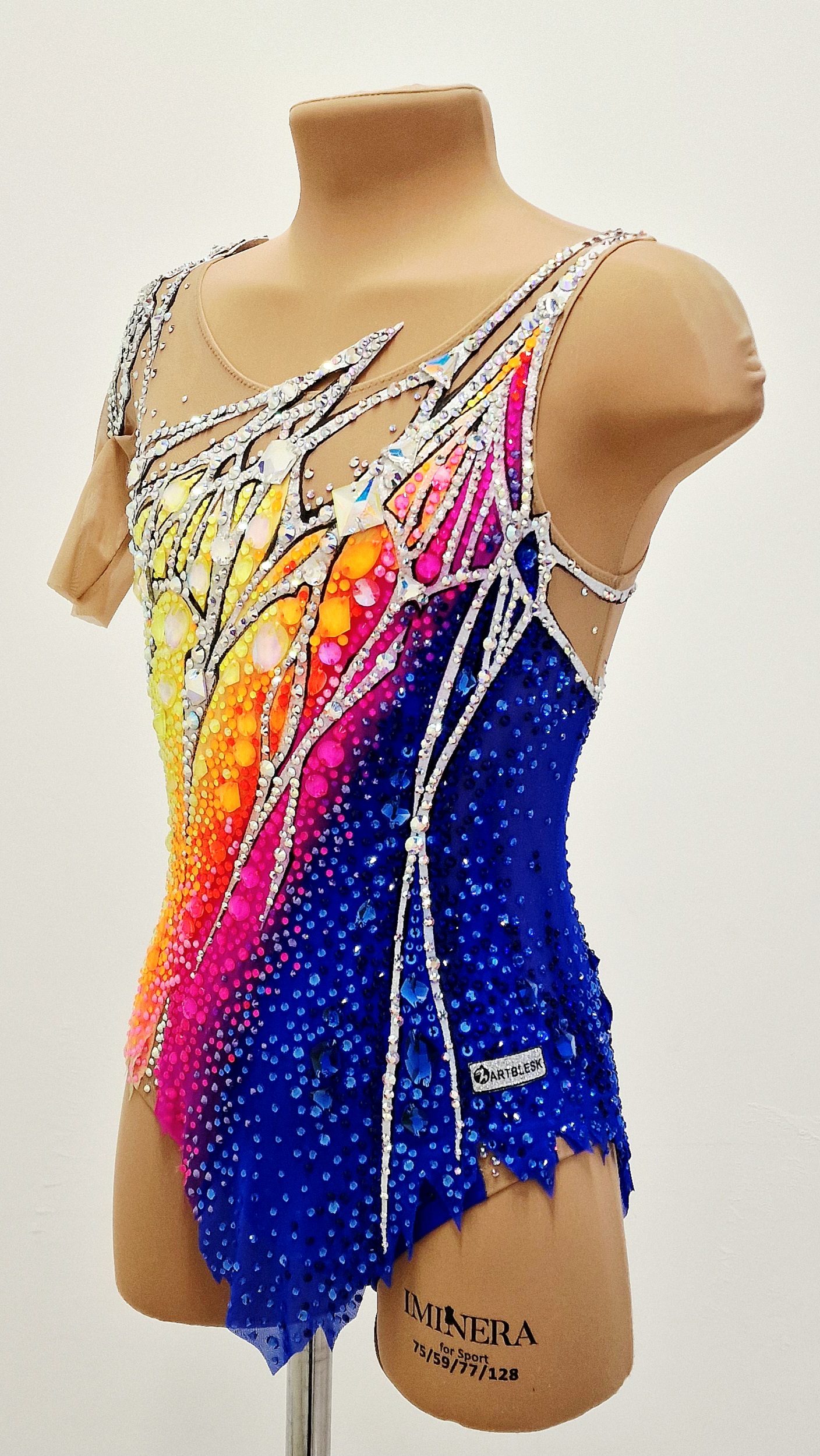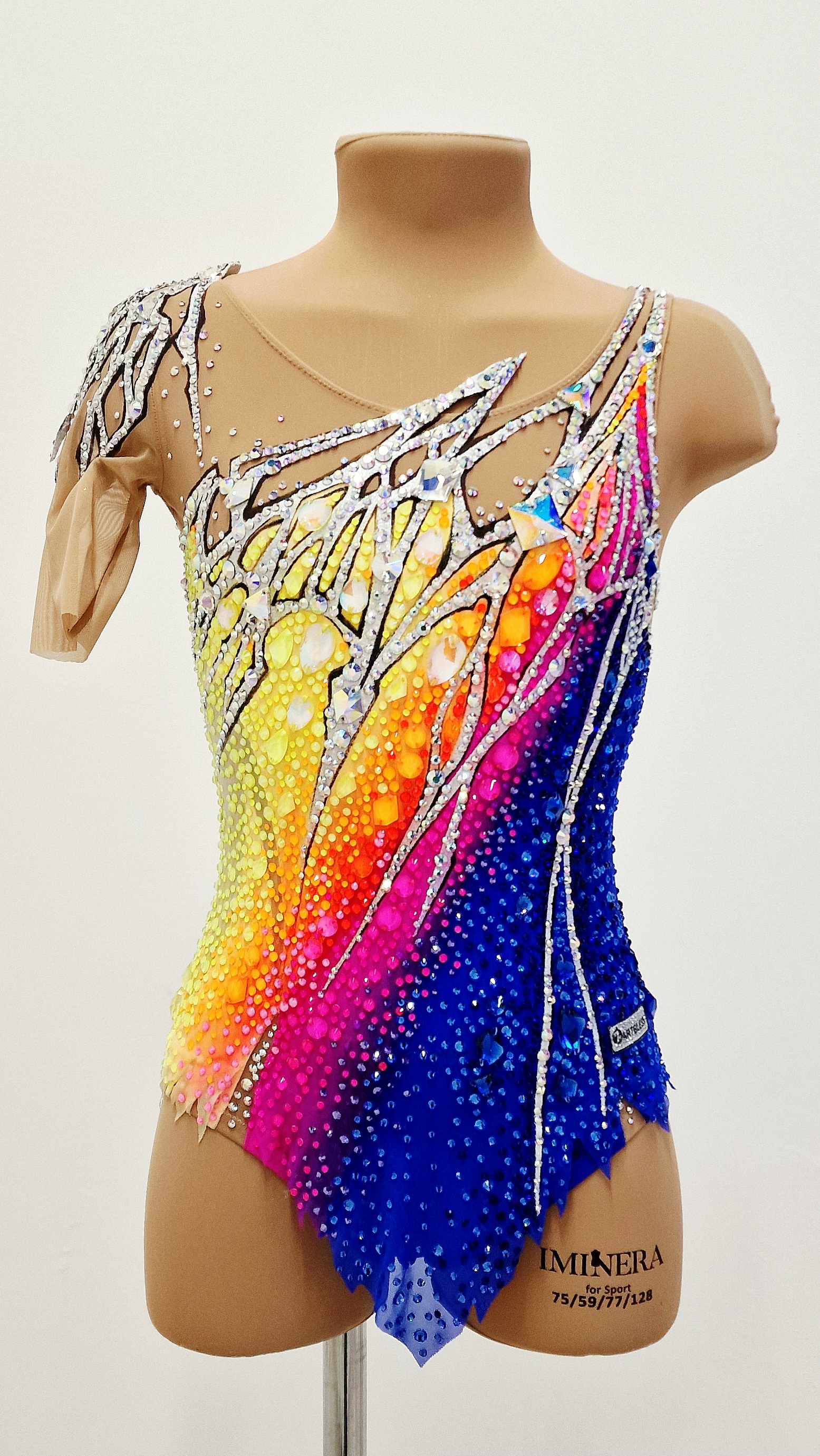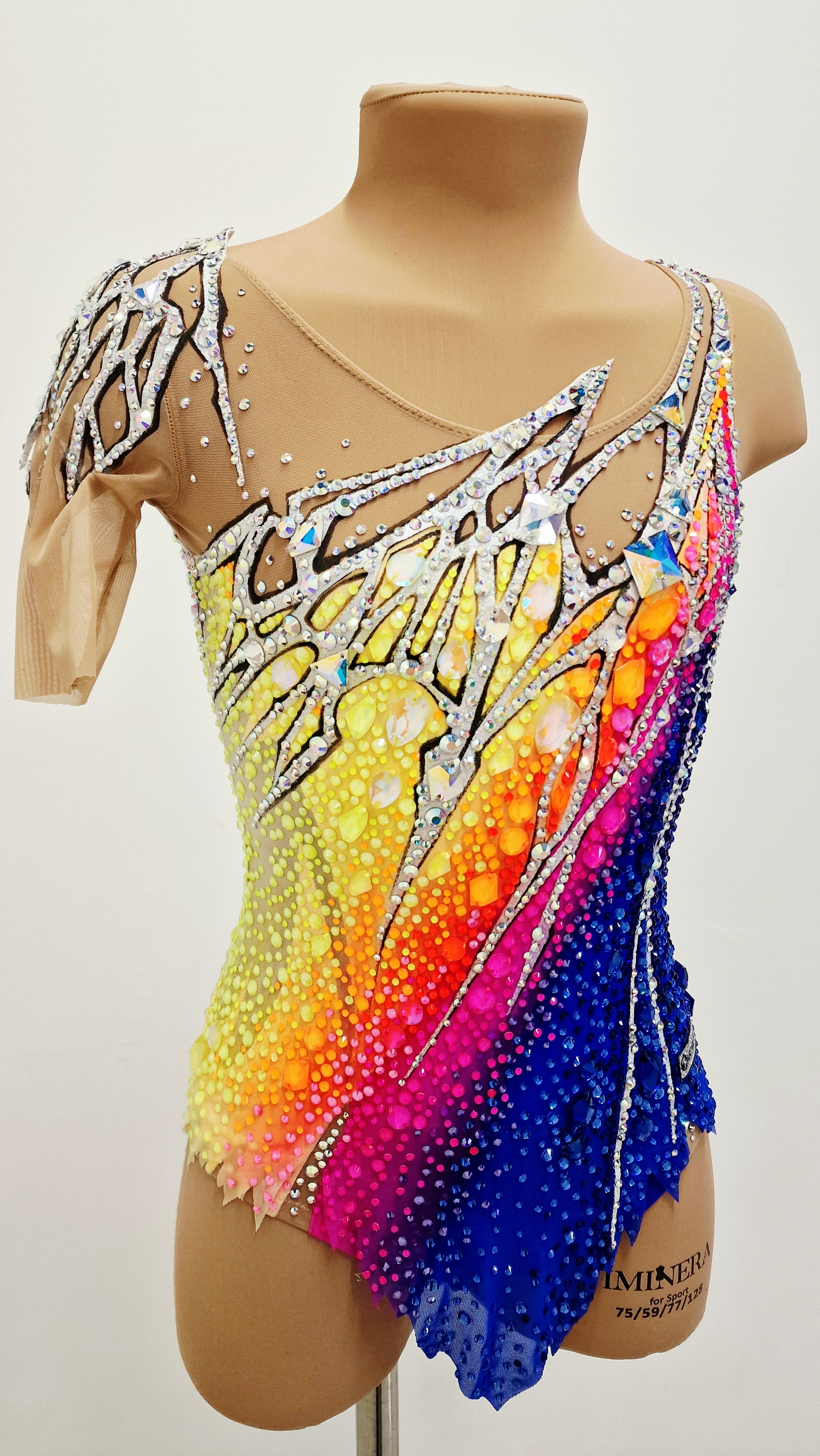 The leotard uses 4,823 adhesive and 110 large sewn rhinestones.