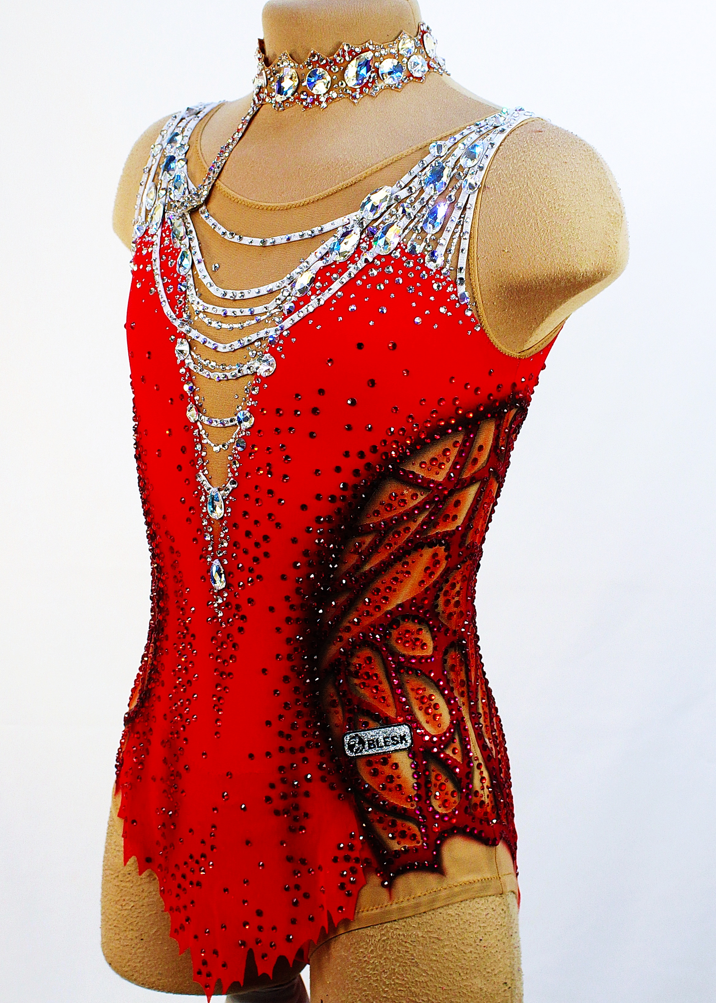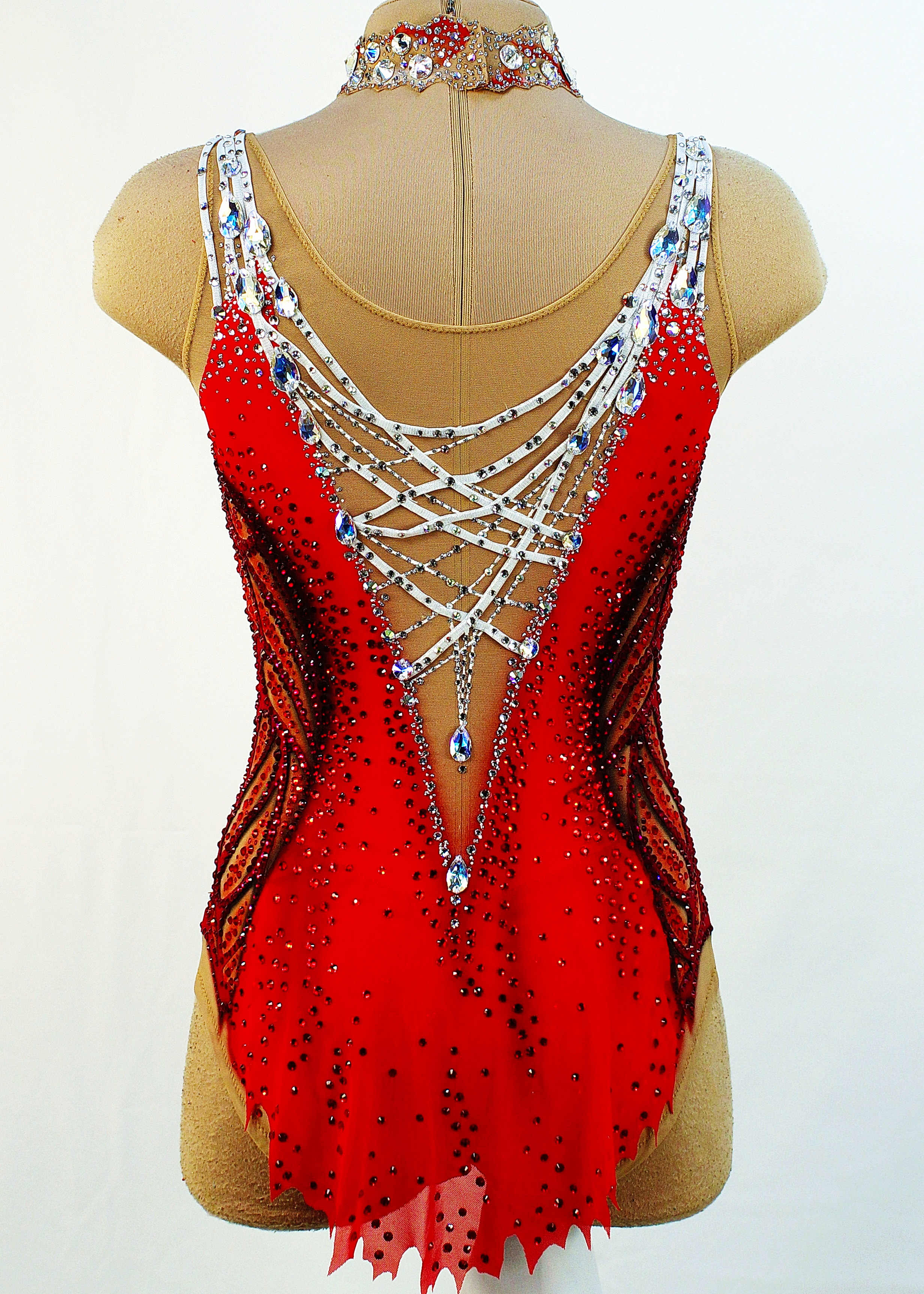 The leotard uses 3,700 adhesive and 70 large sewn rhinestones.